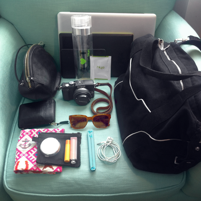 "Macbook 15 inch, Wacom Bamboo Tablet, Kindle, Hiya Cold-brew teabag and bottle, camera, a smaller handbag, wallet, handkerchief, compact, Chapstick, lipstick, a folding fan and earbuds."