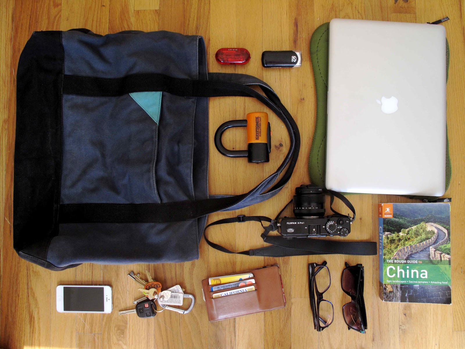 "15" Macbook Pro, Sunglasses, Warby Parker Glasses, Rough Guide to China, Wallet, Keys, Bike Lock, Bike Lights, Fujifilm X-Pro 1, iPhone "