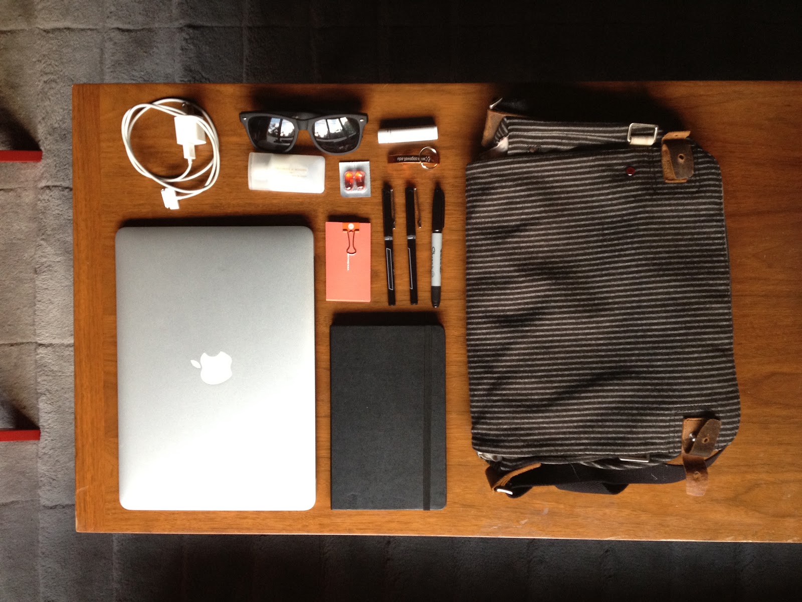 Macbook Air, iPhone charger, sunglasses, lotion, DayQuil, Chapstick, bottle opener, Sharpie, Pilot V5s, business cards, and a Moleskine.