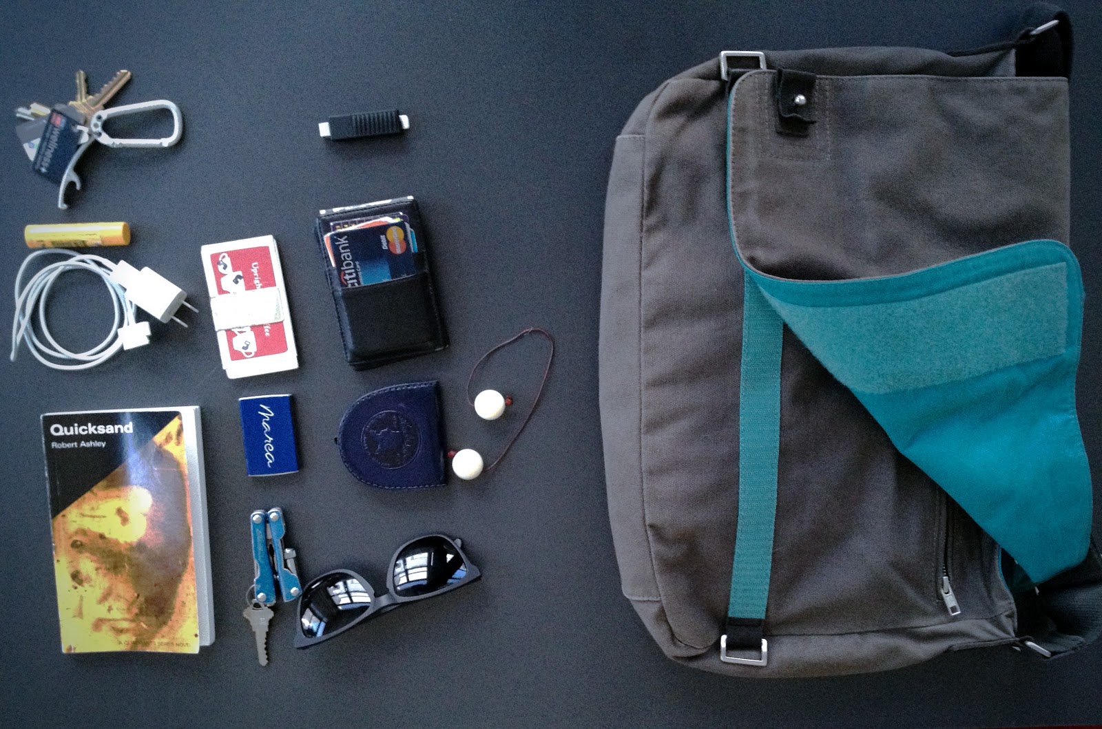 Wallet, Keys, Coin pouch, Sunglasses, Handy pliers/flashlight thingy, collection of coffee shop stamp cards (all almost full). Matches from Marea (good memories connected to those matches), Book "Quicksand by Robert Ashley", USB drive, iPhone charger, Komboloi (greek worry beads - I do sweet tricks w/ these things - it's like pen flipping)